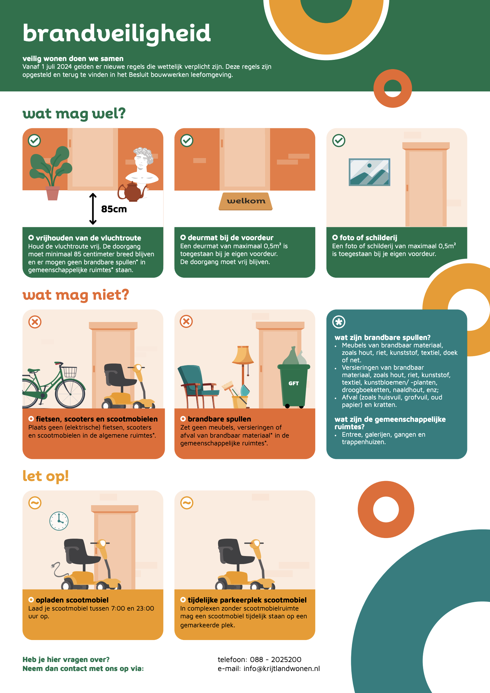 Vanaf 1 juli 2024 gelden nieuwe regels over het vrijhouden van vluchtroutes. In vluchtroutes mogen geen brandgevaarlijke spullen en vervoersmiddelen staan zoals (elektrische) fietsen en scootmobielen. Hieronder lees je wat wel en niet mag.