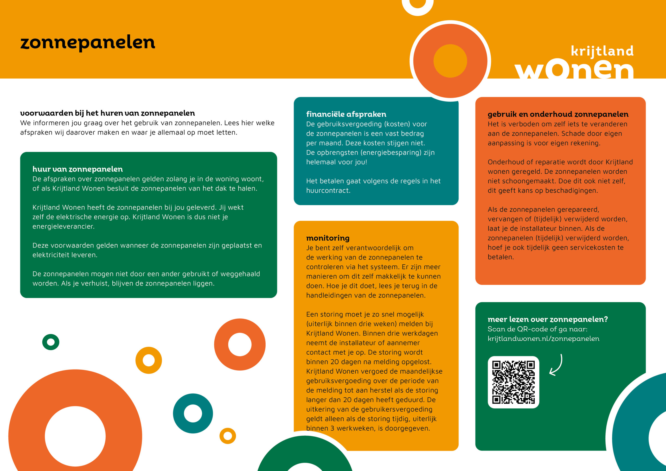 Krijtland Wonen legt eerst zonnepanelen bij eengezinswoningen die nog geen zonnepanelen hebben. Wil je weten of jij ook zonnepanelen kunt krijgen? Neem dan contact op met Krijtland Wonen.